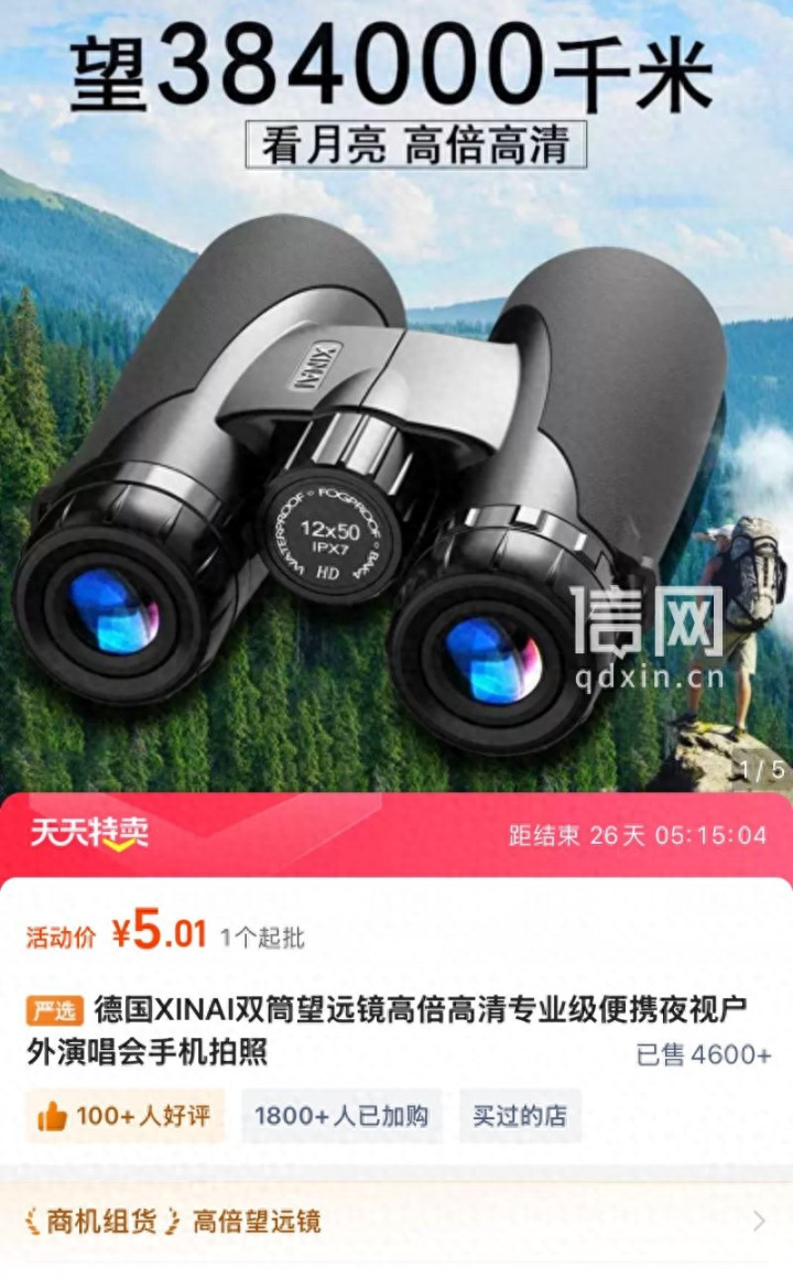 赵先生说,他在1688平台“东阳市慕清电子商务商行”店铺刷到一款“德国XINAI高倍高清双筒望远镜”。商家的产品介绍非常吸引人:能链接手机拍照录像,能看清384000千米外的景象,还是“看月球演唱会至尊款”。
