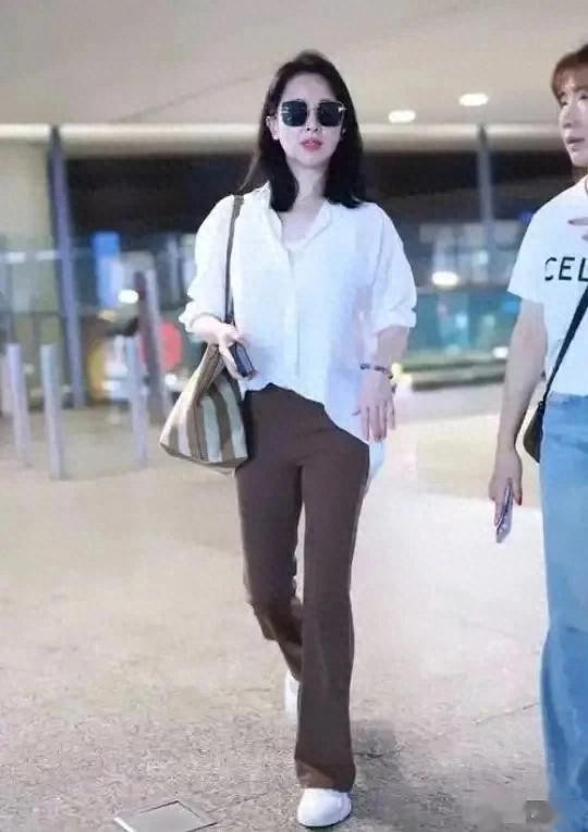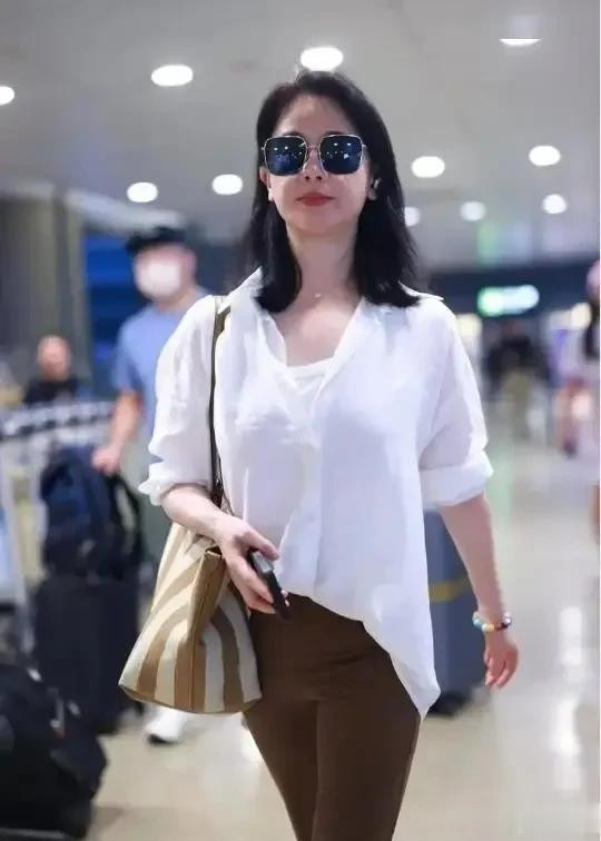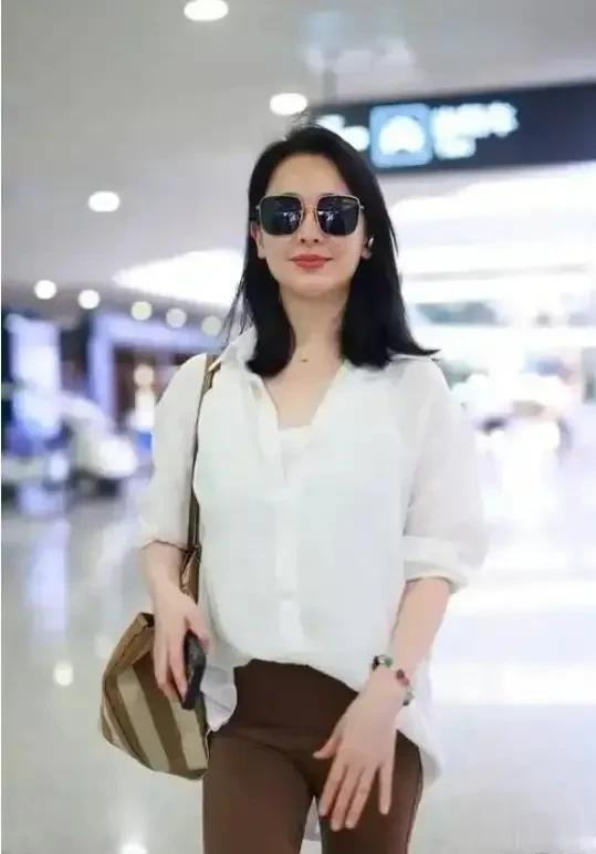 左小青真是中年女人的穿搭标杆! 白色衬衫+咖色长裤, 简约又洋气